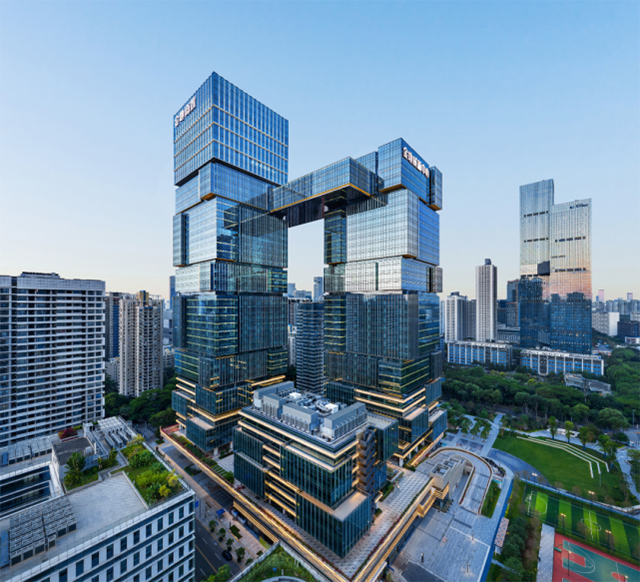 深圳金地威新中心优踞于中国南硅谷粤海街道高新南十道 16 号,总建面约 28 万平方米,涵盖了 2 座超高层双子塔楼(A塔 45 层、B塔 36 层)及 1 座总部办公楼综合体(C塔 9 层),由全球知名建筑设计单位CallisonRTKL设计。